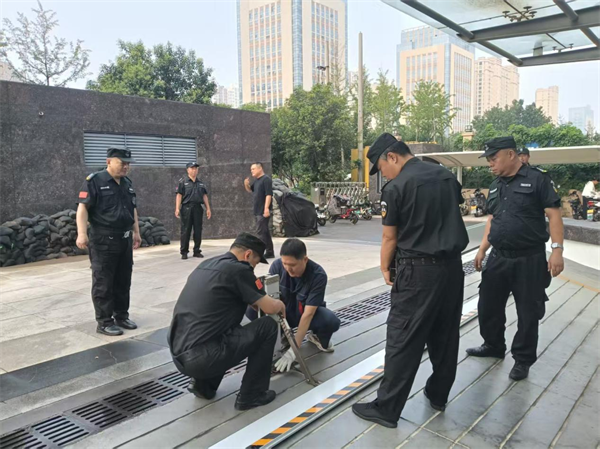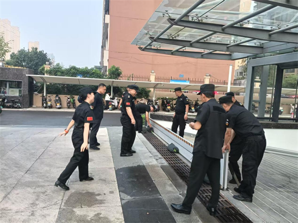 此次演練模擬了暴雨導(dǎo)致雨水倒灌、地下停車場積水等險(xiǎn)情。全體隊(duì)員迅速響應(yīng),按照預(yù)案分工協(xié)作,保安隊(duì)員第一時(shí)放置擋水板和堆砌沙袋,并將重要物資轉(zhuǎn)移安全。