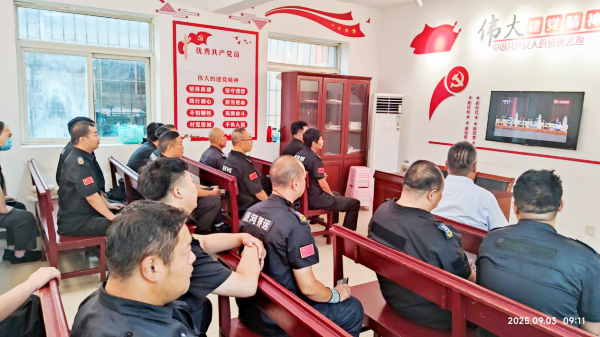 為慶??箲?zhàn)勝利80周年,9月3日上午,守押一大隊精心組織全體隊員集中觀看閱兵直播。
